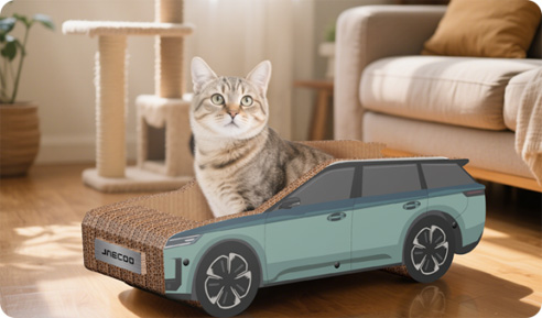 La propuesta se completa con un accesorio de carácter más lúdico, el rascador con diseño inspirado en el propio JAECOO, pensado para el entorno doméstico y que refuerza el vínculo entre la marca y el universo pet más allá del vehículo.