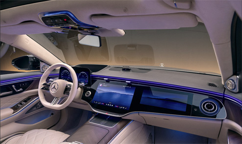La pantalla en la que se ve la instrumentación tiene 12,3 pulgadas, la del centro tiene 14,4 pulgadas y la que hay delante del acompañante es de 12,3 pulgadas. Asimismo hay un sistema de proyección de información en el parabrisas (Head-up Display) con función de realidad aumentada. El sistema de reconocimiento de órdenes vocales —MBUX Virtual Assistant— se apoya en la tecnología ChatGPT4o, Microsoft Bing y Google Gemini Automotive AI para poder cumplir con los requerimientos del conductor mediante una conversación con lenguaje natural. Debajo de la pantalla central hay dos superficies para la carga por inducción de teléfonos móviles.