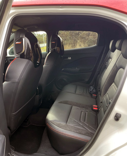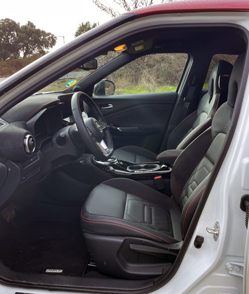 Lo que ahora viene al caso comentar es que el Juke es un coche que, visto desde fuera, parece más pequeño de lo que en realidad es. O sea, es un coche de 420 x 180 centímetros (largo por ancho), pero parece más pequeño cuando por dentro es más grande. Yo creo que es por lo recortado de sus voladizos, la caída del techo, el ensanchamiento de sus pasos de rueda o el pequeño tamaño de sus puertas y ventanillas traseras. Bueno, pues vamos dentro.