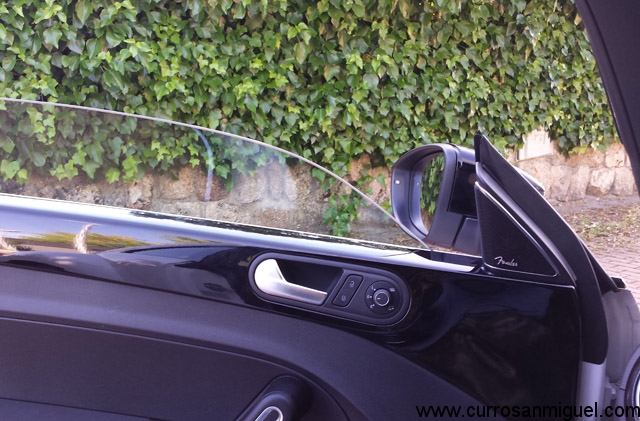 También hay buenos espacios en las puertas, junto a unos altavoces cuyo aro se ilumina de noche y que forman parte del equipo de sonido Fender adicional. Respecto a esta opción, diré que me ha gustado mucho. Tiene una gran potencia y calidad de reproducción. Además, no es caro. Seguro que es prescindible pero yo, en mi Beetle ideal, contaría con ello.